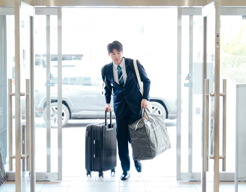 スーツケースを手に少し緊張した表情で受付を済ませる姿が、とても初々しく印象的です。