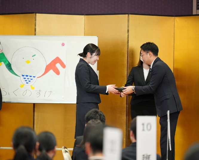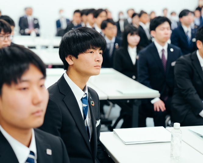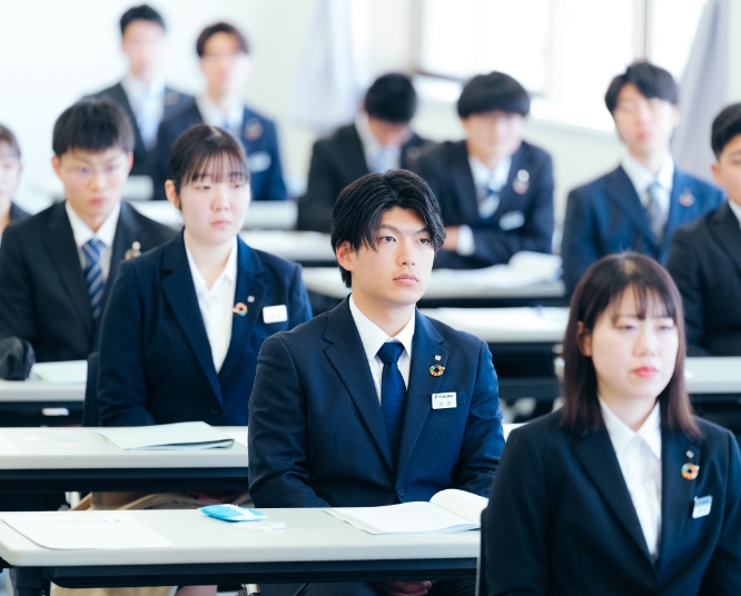 新入社員が一堂に会し、辞令交付を受けて社会人としての第一歩を踏み出します。