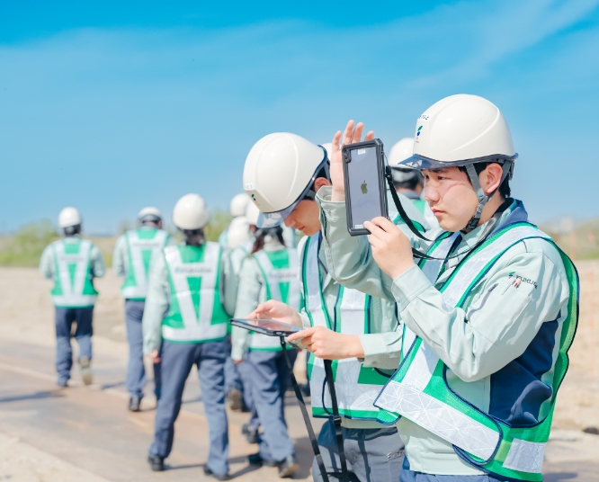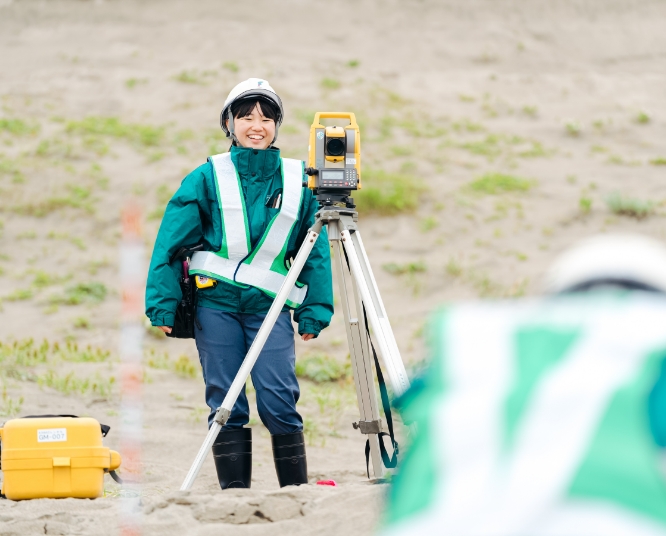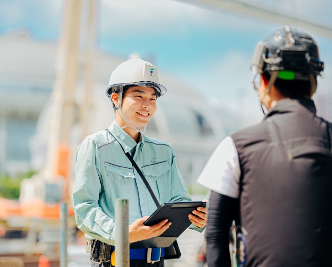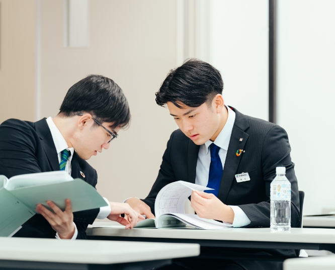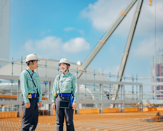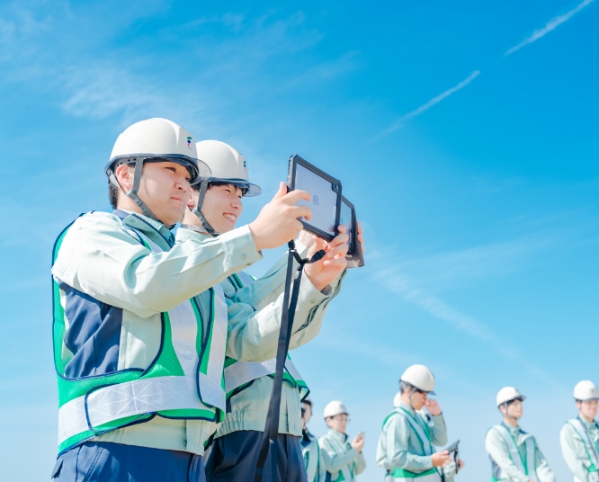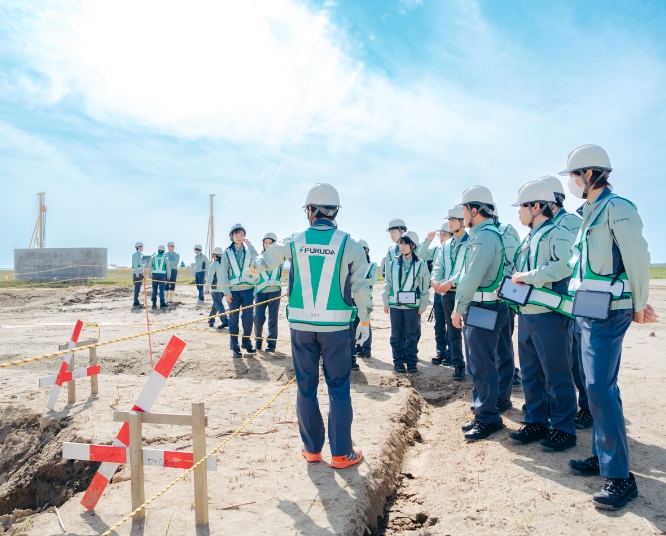 設計、建築設備、管理部の社員は5月中に各部門へ配属されます。また、土木・建築施工管理の社員は6月上旬に各地の施工現場へ仮配属され、先輩社員の指導のもと、実務を通じて施工管理や業務の基本を学びます。
