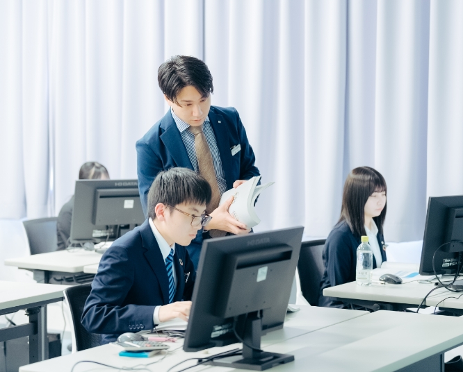 土木・建築・管理の各部門に分かれ、座学や測量体験(施工管理)、PCによる経理演習(管理担当)などを通して、専門知識や実技を学びます。
