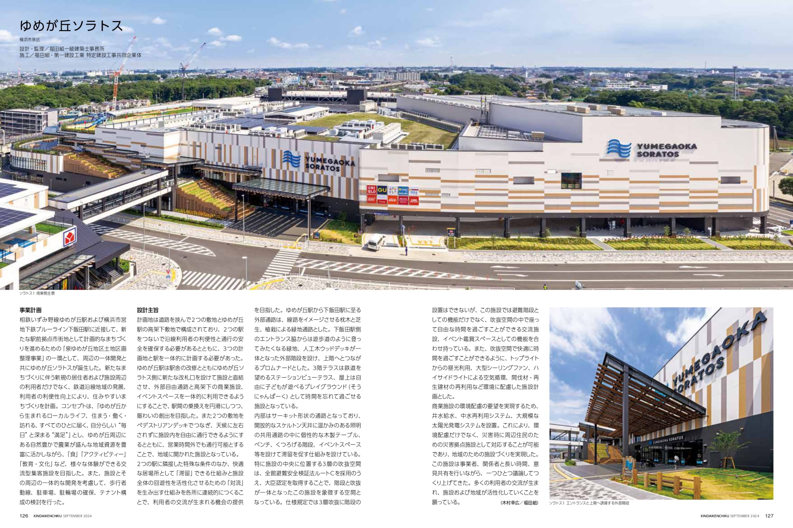 当社が設計・施工を担当した横浜の商業施設「ゆめが丘ソラトス」と、施工を担当した盛岡の複合施設「monaka」が、近代建築9月号にて特集されました。両施設とも地域特性を生かしたデザインと、持続可能な建築技術が高く評価されています。