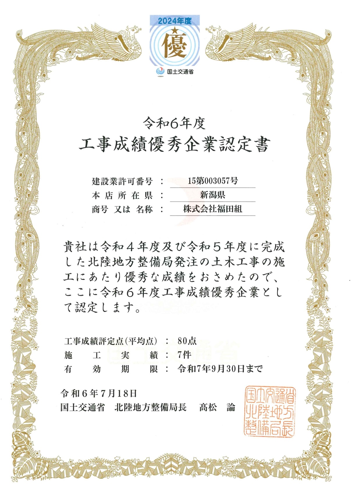 「工事成績優秀企業」認定とは、過去2ヶ年に北陸地方整備局が所管する土木工事において、工事成績評定点の平均が特に優秀な企業が認定されるものです。これにより、当社が施工した工事の品質と技術力が評価されたことを大変光栄に思います。