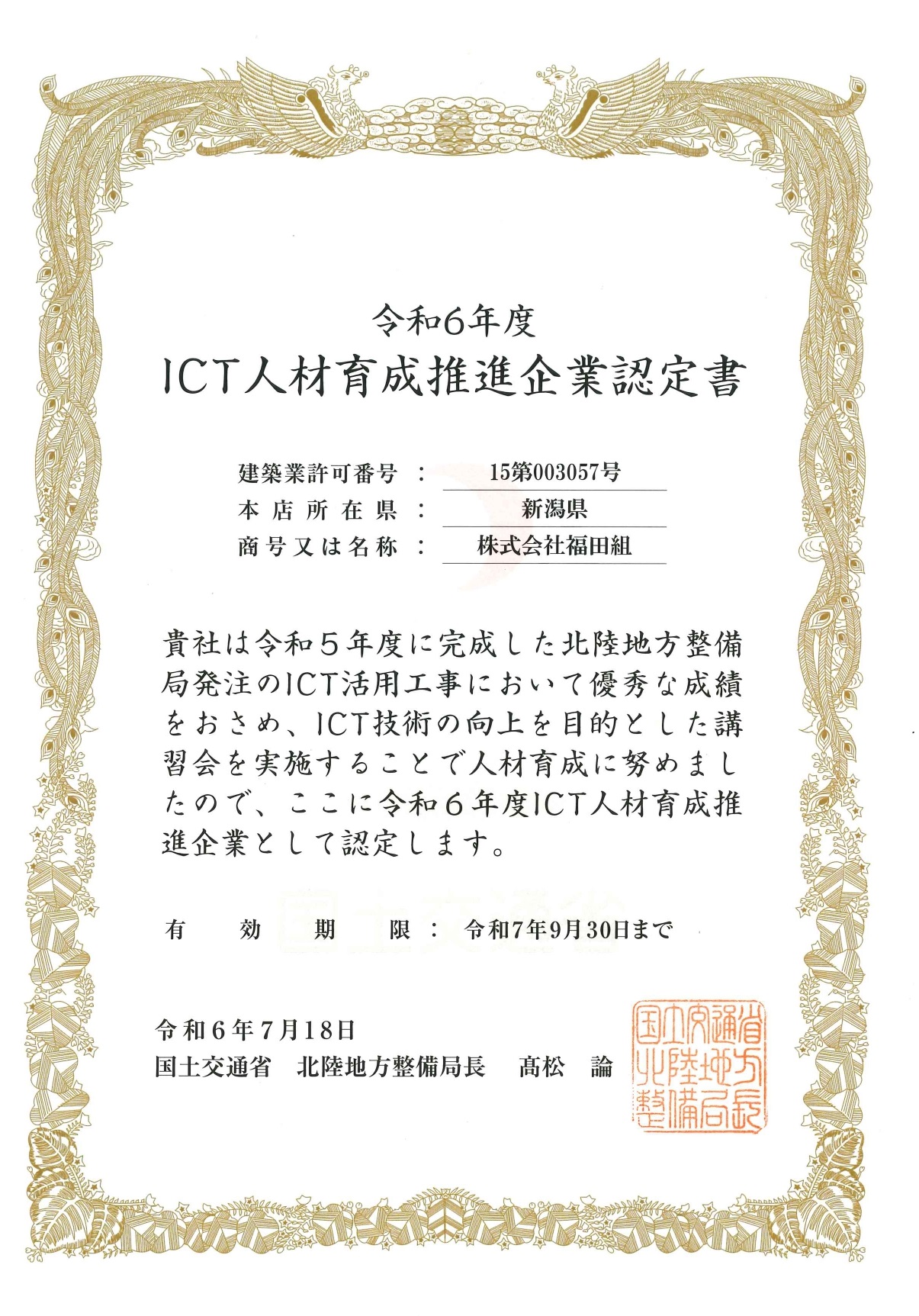 北陸地方整備局様より、令和6年度の「工事成績優秀企業」および「ICT人材育成推進企業」の認定を頂きました。