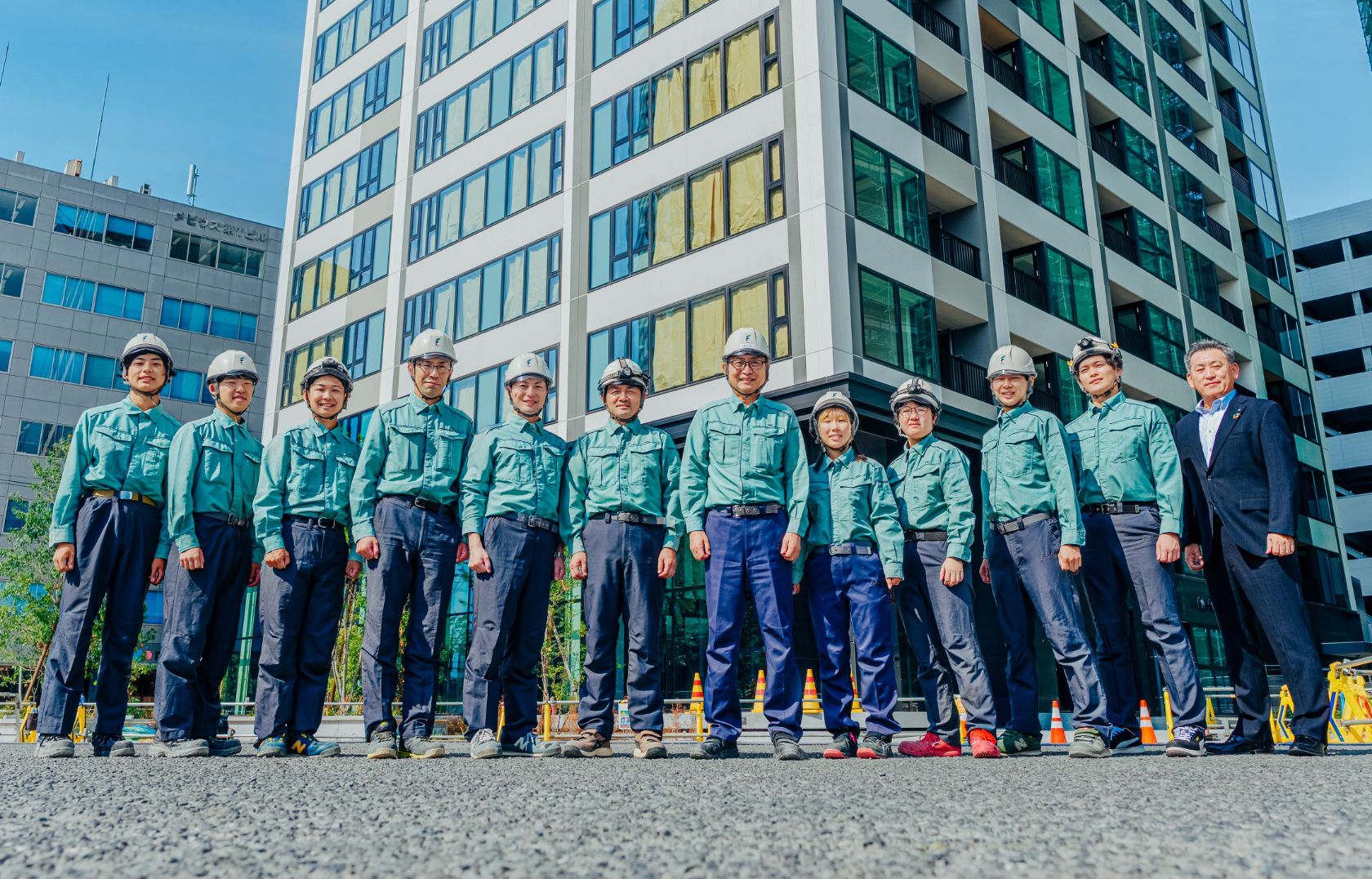 2026年2月、オフィス棟の竣工。3年半の長きに渡る当プロジェクトは、これをもって完了します。その頃には、マンション住民の方々の暮らしも落ち着き、ご家族のにぎやかな声が聞こえているかもしれません。来春オフィス棟には多くの企業様が入居され、新たなビジネスが始まります。また棟内には学校も開校するため、多くの学生の皆さんが集う場となります。私たち福田組の仕事は建物を建てるだけでなく、このような新たな人の暮らし・生活の場をつくる、「まちの明日をかたちにする仕事」です。来春のこの地の賑わいを今から楽しみにしつつ、オフィス棟竣工まで安全第一で管理を進めます。