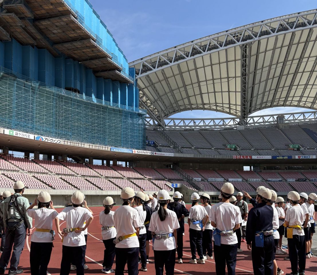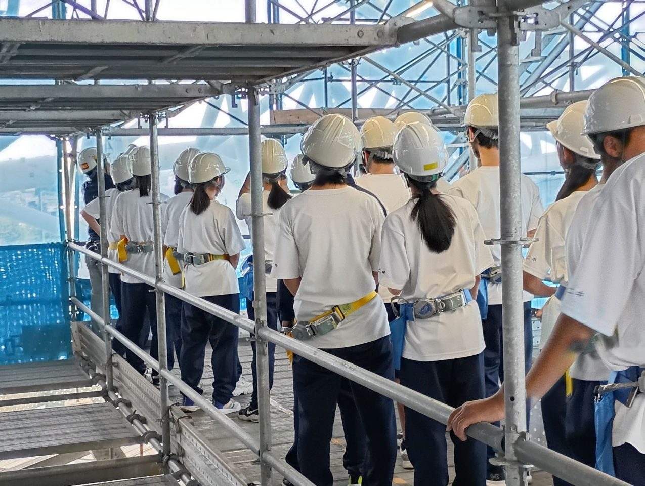 現場内の移動では、「足元・頭上注意」と声を掛け合いながら慎重に進みました。はじめは緊張していた生徒さんたちも、次第に慣れて周囲を見回しながら歩くようになり、建設現場特有の雰囲気を楽しんでいる様子がうかがえました。