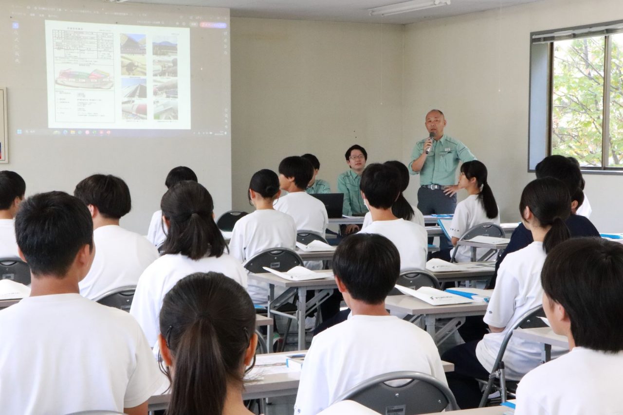 はじめに現場事務所にて人事部から会社概要を、所長から工事概要を説明。生徒の皆さんはメモをとりながら真剣に耳を傾け、時折うなずきながら聞き入る姿が印象的でした。普段なかなか接することのない建設業の話に、興味を持ってもらえたのではないかと思います。