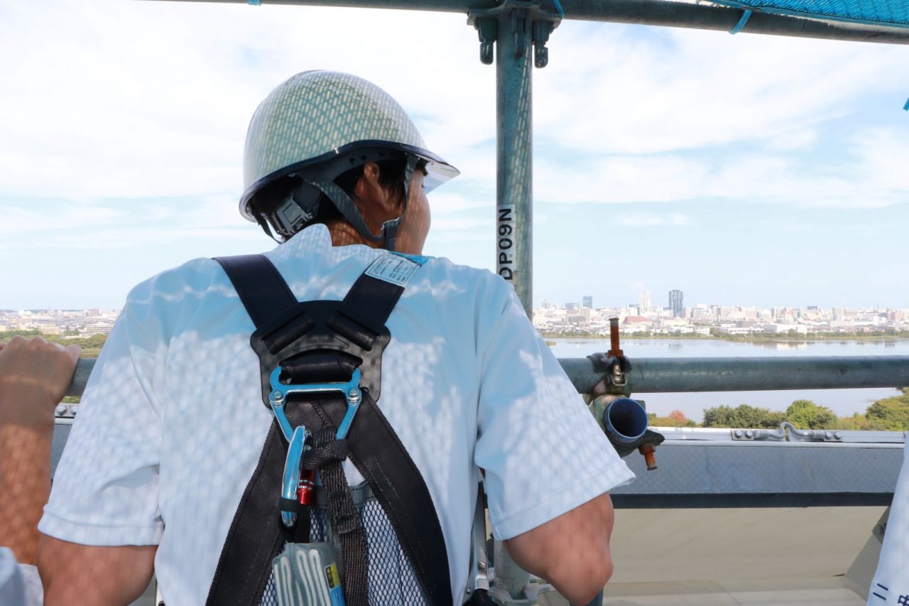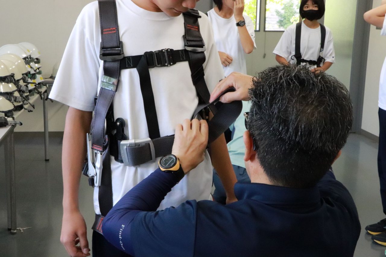 説明を終えた後は、いよいよ現場へ移動。まずは安全装備の着用です。ヘルメットに加え、この日は代表生徒数人にフルハーネスを体験してもらいました。見慣れない装具に「どうやって着るの?」「ベルトがたくさんあって難しい!」と戸惑う様子もありましたが、社員の指導を受けながら一つずつ装着。体にしっかりフィットした瞬間には「かっこいい!」と笑顔を見せる生徒さんもいて、少し誇らしげな表情が印象的でした。普段体験できない装備を実際に身につけることで、現場で働く人たちの工夫や安全への取り組みを肌で感じてもらえたように思います。