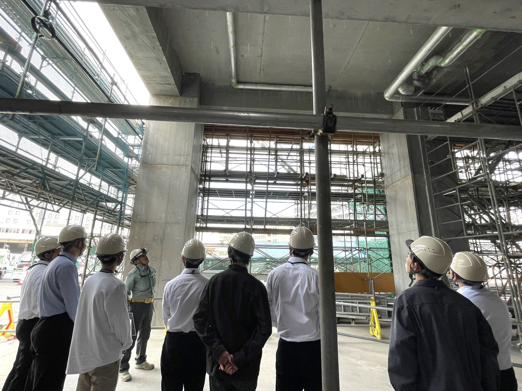 所長から工事の進行状況や施工内容などの説明を受け、実際の現場がどのように動いているのかを肌で感じていただきました。普段は見ることのできない現場のスケール感を体感し、建設業のダイナミックさを実感していただけたのではないでしょうか。