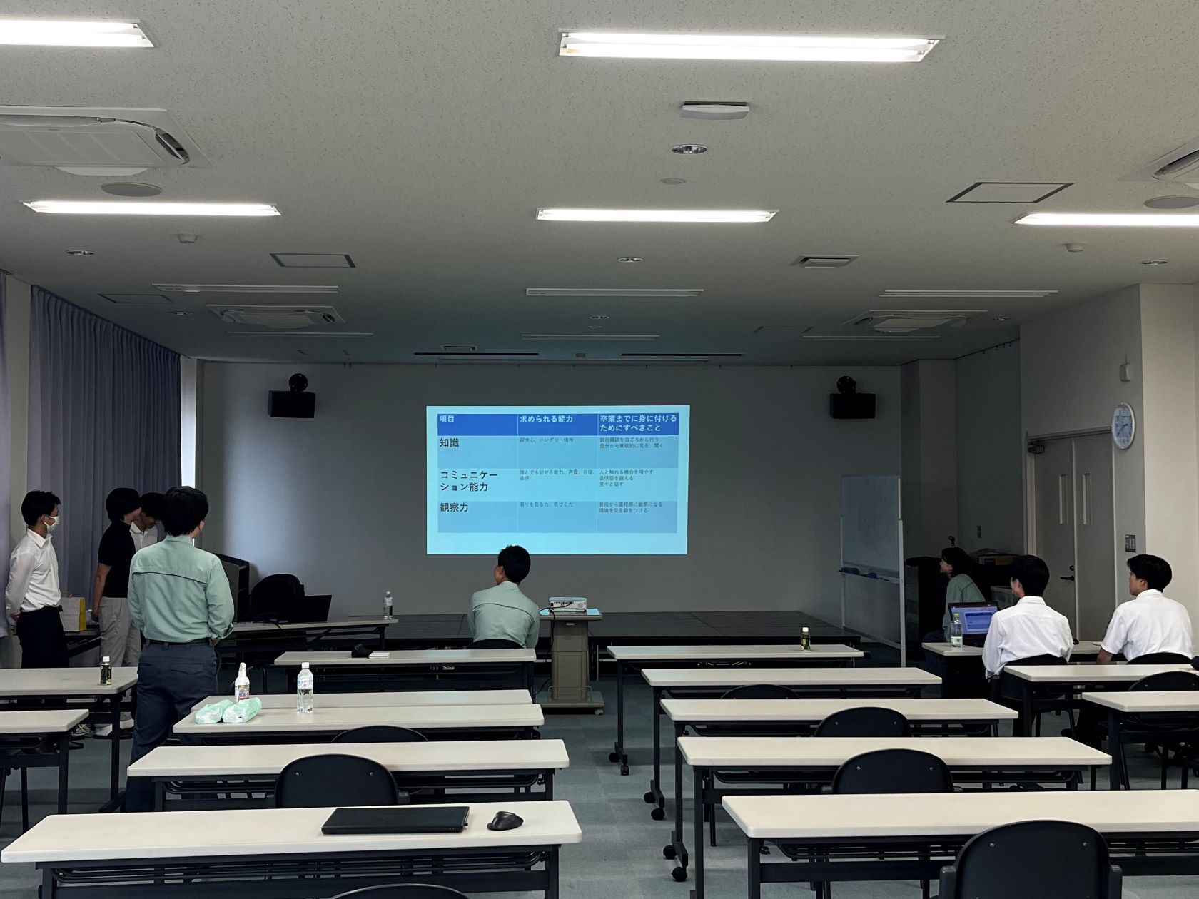 続いて、人事部より会社説明や施工管理の業務内容について説明を行い、福田組への理解を深めていただきました。その後、施工管理で重要な考え方である「QCDSE」をテーマにしたグループワークを実施し、「もし自分が発注者・施主であった場合、ゼネコン(元請け)に期待するQCDSEとは何か」というテーマのもと、グループに分かれて意見を出し合い、発表を行っていただきました