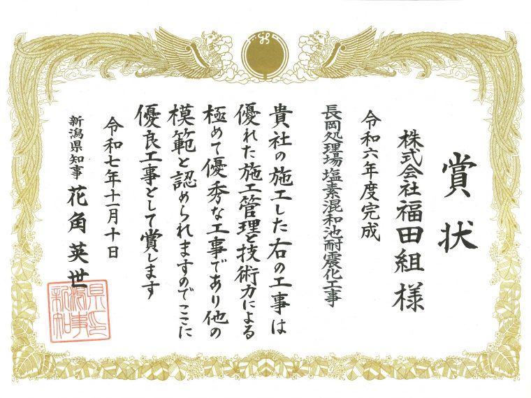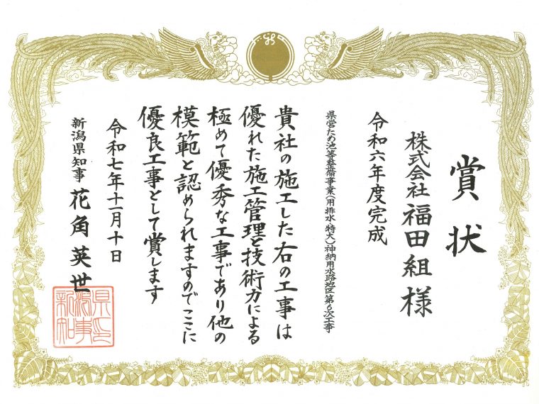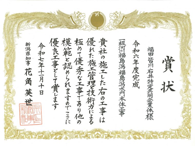 新潟県優良工事表彰は、県が発注した公共工事の中で、特に施工管理、品質、安全性、環境配慮などにおいて優秀と認められた工事を表彰する制度です。施工の完成度だけでなく、地域への配慮や安全管理の徹底なども評価され、公共事業の模範となる取り組みが認められます。今回当社が受賞した工事も、こうした評価基準に基づき選出されました。