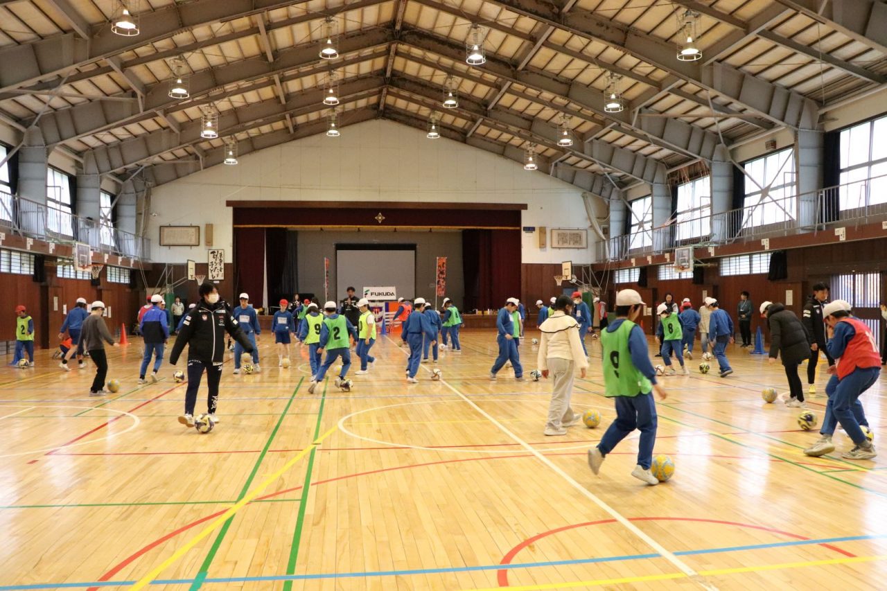 当日はあいにくの天候でしたが、体育館に会場を変更しての開催となりました。雨や風に関係なく、6年生の生徒全員が元気いっぱいにボールを追いかけ、ドリブルやパスの練習に挑戦する姿は、見ているこちらも思わず笑顔になるほど活気にあふれていました。