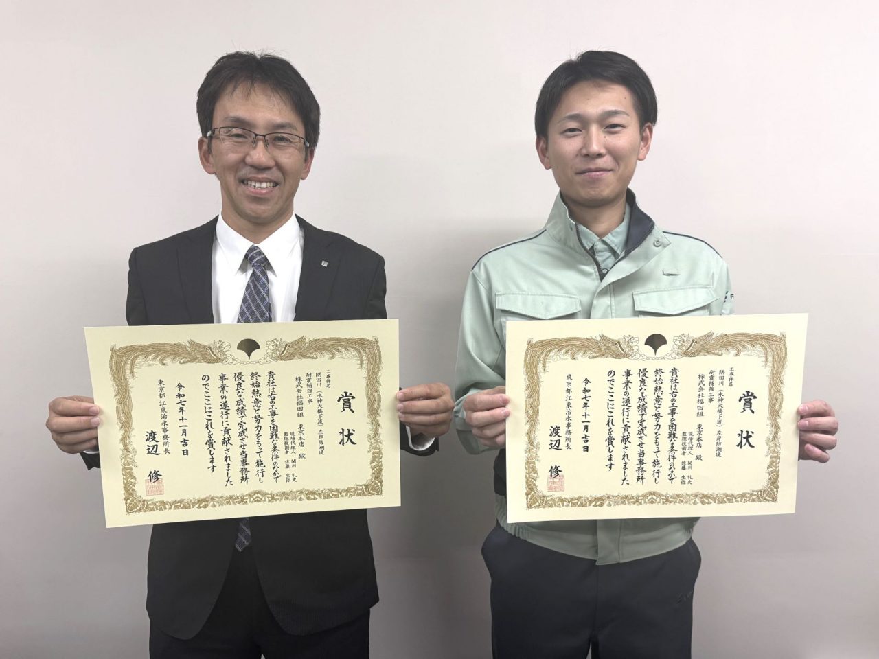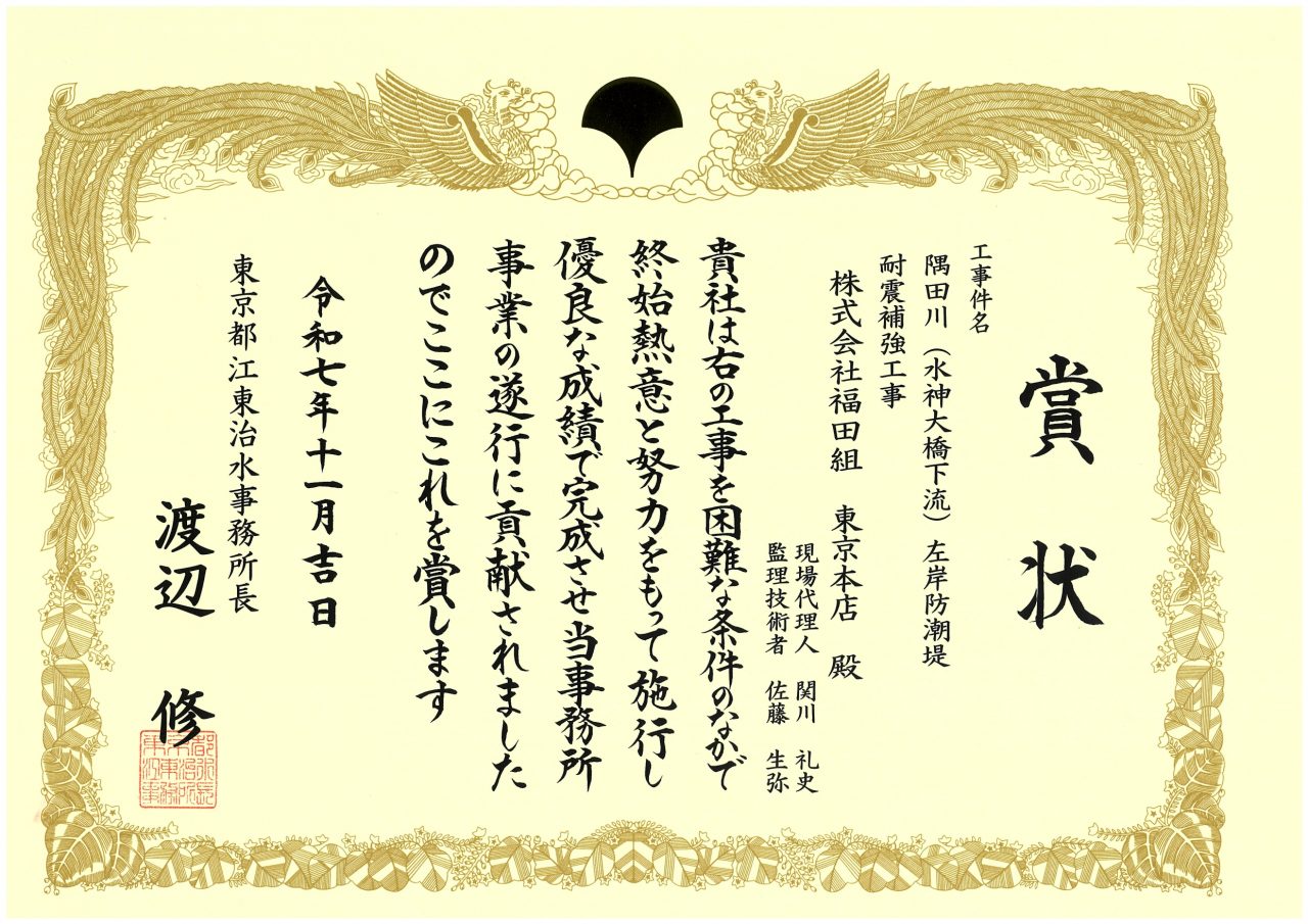 このたび当社が施工を担当した「隅田川防潮堤耐震工事」が、優良な成績で完成した現場として表彰を受けました。困難な条件下においても、現場が一体となって粘り強く取り組み、最後まで熱意をもって施工を進めた点が高く評価されたものです。