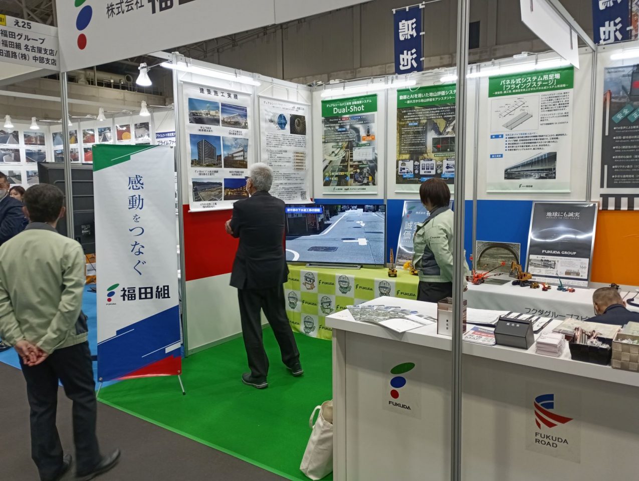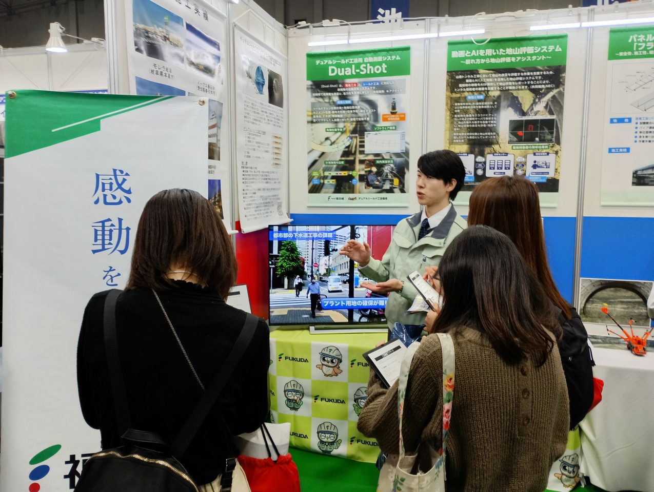 当社は、昨年に続きフクダグループの福田道路と共同でブースを設け、デュアルシールド工法の紹介を中心に、パネルおよび動画を用いた展示を行いました。より多くの方に当社の取り組みを知っていただけるよう展示内容を昨年より拡充し、工法の特徴や活用イメージが伝わりやすい構成としました。