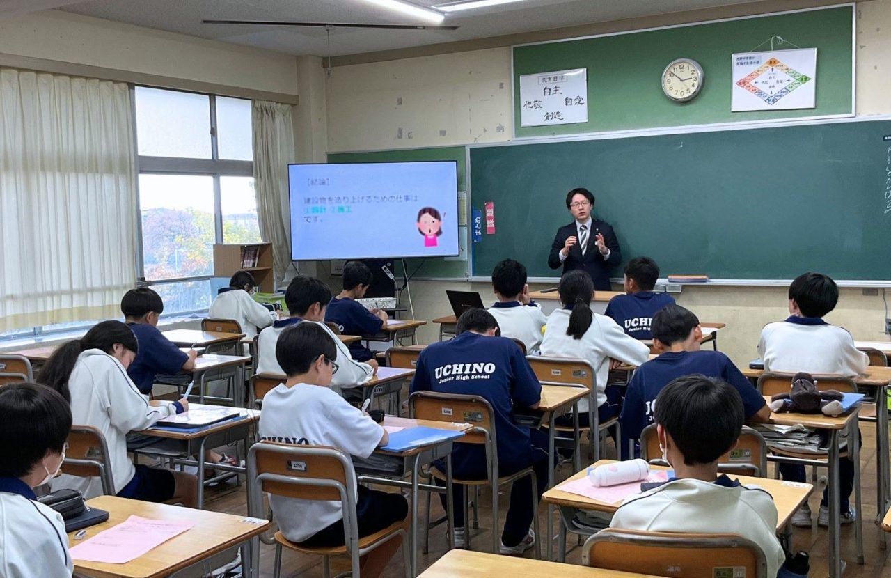 2025年11月には、弊社人事部の担当者が内野中学校を訪問し、普段の生活では意識する機会の少ない建設業の役割やまちづくりとの関わりについて生徒の皆さんに少しでも身近に感じていただけるよう、建設業界全体の概要や福田組の事業内容についてお話しさせていただきました。その後、探究活動の課題として「建設工事に関して、自分たちの町をもっと住みやすくするには?」というテーマを提示しました。