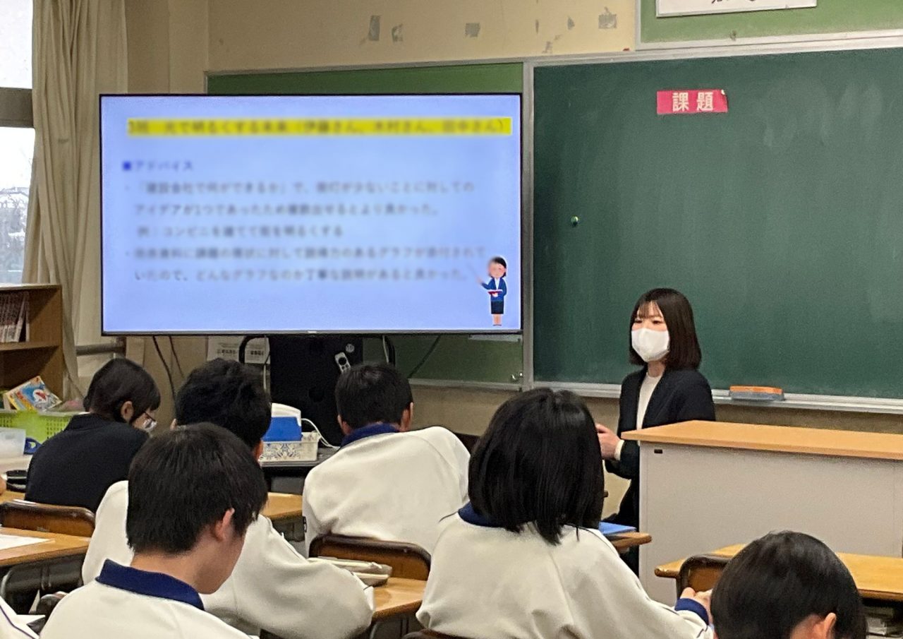 生徒の皆さんがまとめた探究の成果は発表動画として作成され、2026年1月にはその発表動画に対する講評を行うため、再び内野中学校を訪問しました。各グループからは、道路や施設の整備、環境への配慮、地域の活性化につながる提案など多彩なアイデアが発表され、実際の地域調査や情報収集をもとに、よく考え抜かれた内容であることが伝わってきました。