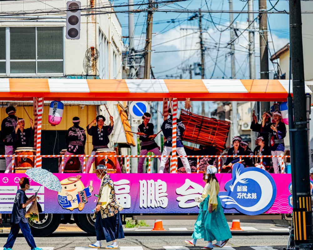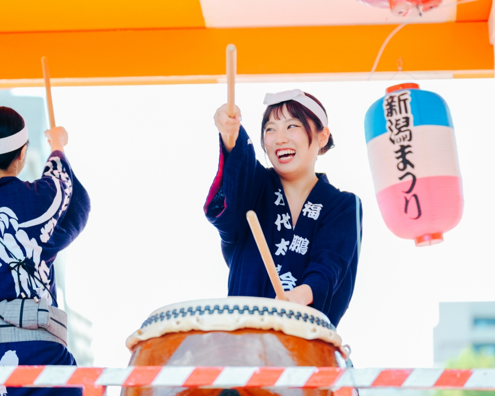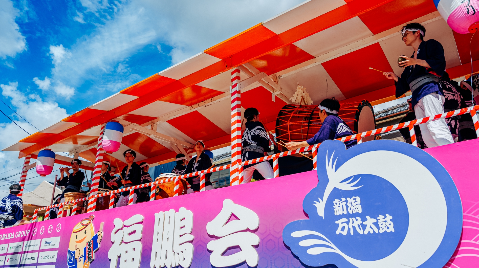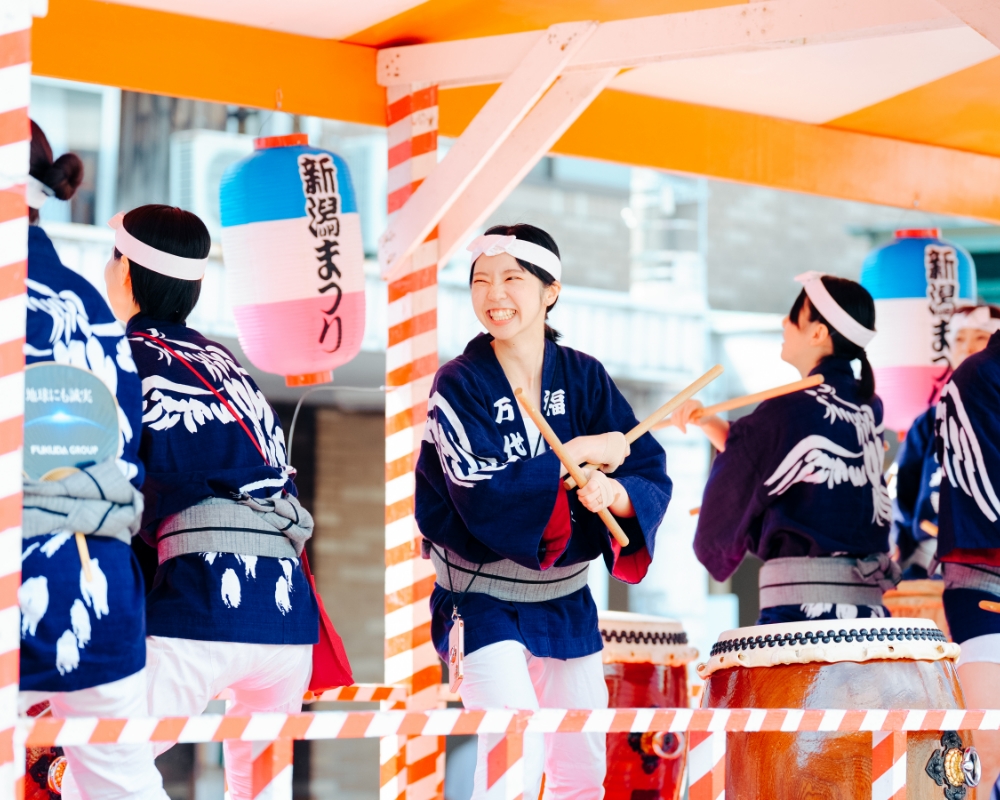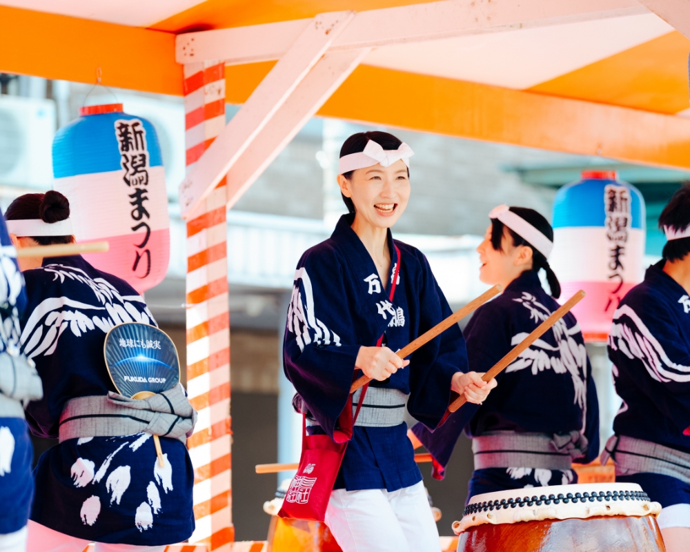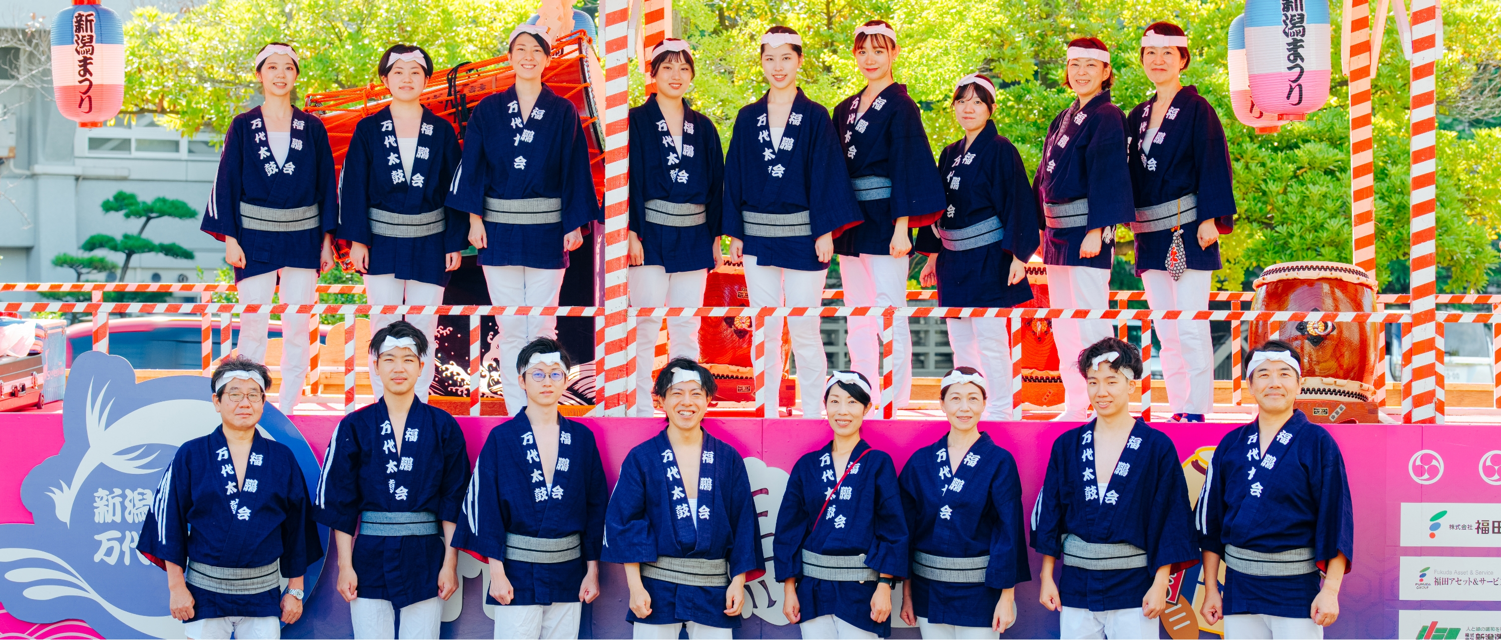 毎年8月初旬に開催される「新潟まつり」。まちなかを練り歩く神輿と共に祭りを盛り上げるのが、万代太鼓のお囃子です。万代太鼓は1968(昭和43)年に、新潟まつりの活性化を願い生まれたもの。軽快な篠笛がメロディーを奏で、大小の和太鼓と樽太鼓がリズムを刻み、金属製の打楽器「あたりがね」が高音のアクセントを加えます。新潟市内に約20の演奏団体があり、1979(昭和54)年創設の「万代太鼓 福鵬会」はフクダグループ社員で構成される、通年で活動している唯一の企業団体です。現在中心となって活動する若手4名と大ベテラン1名が、今年の新潟まつりを振り返ります。