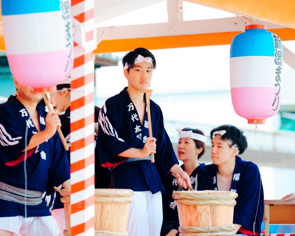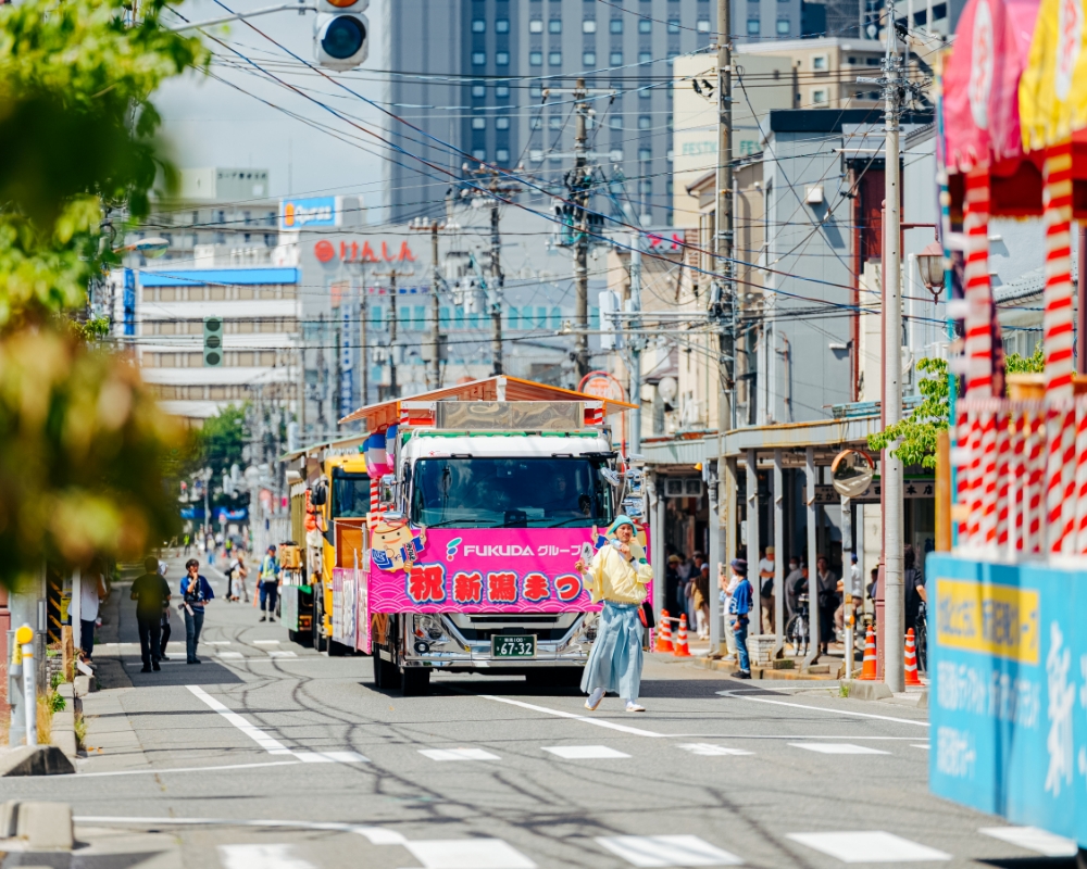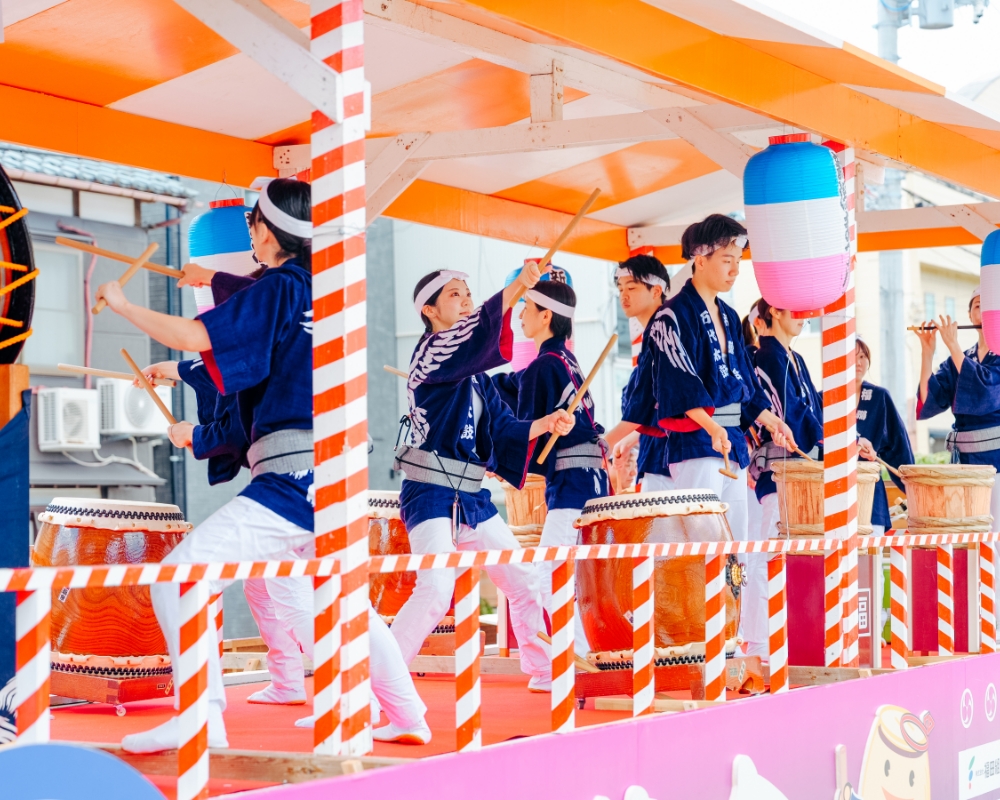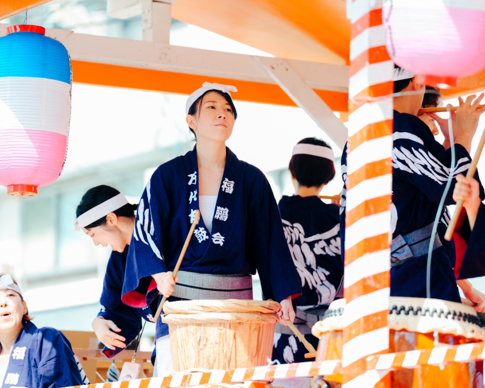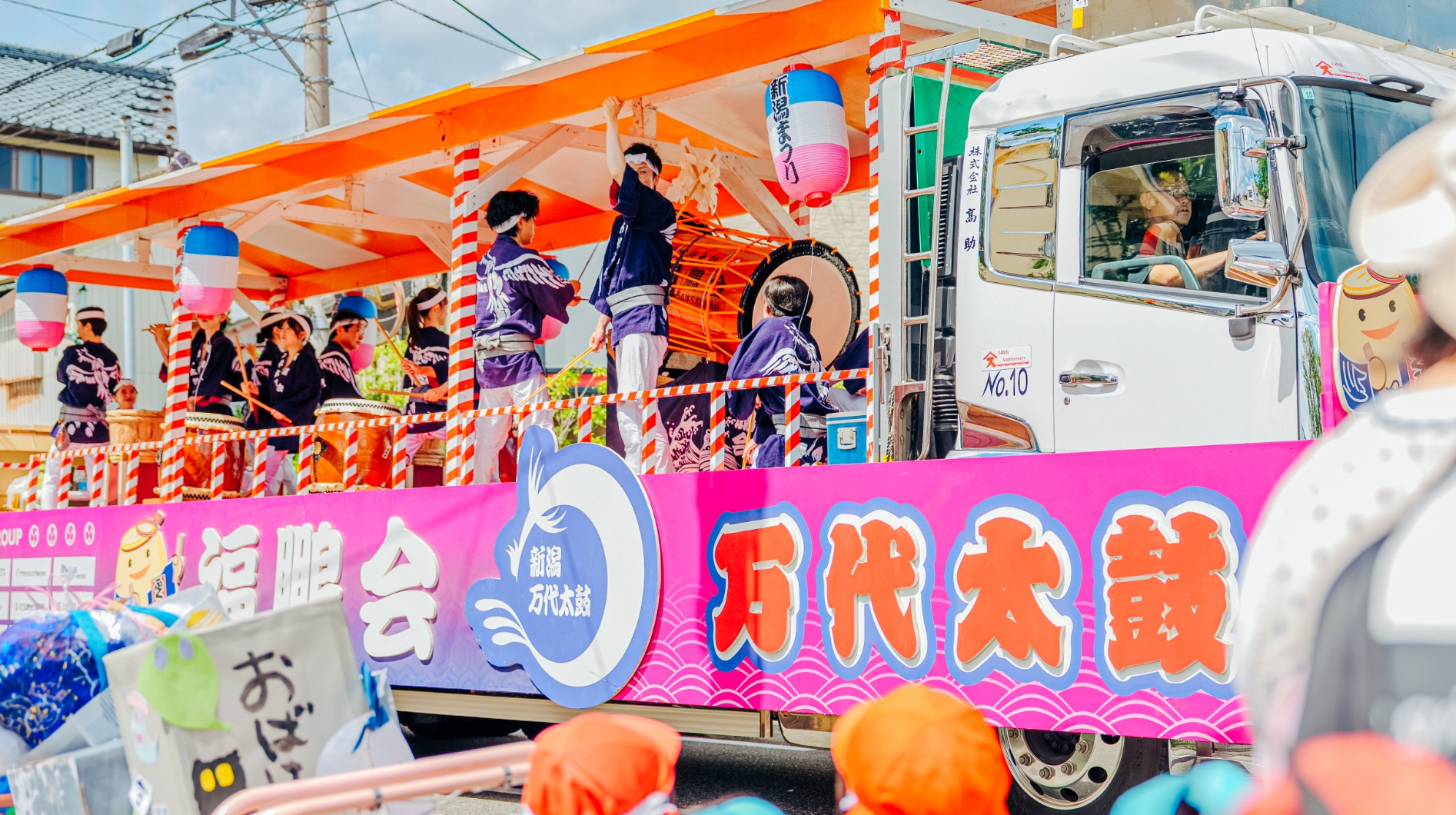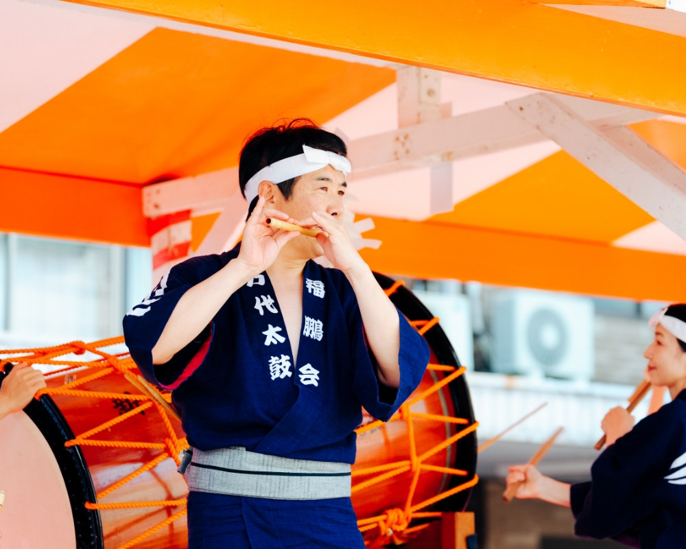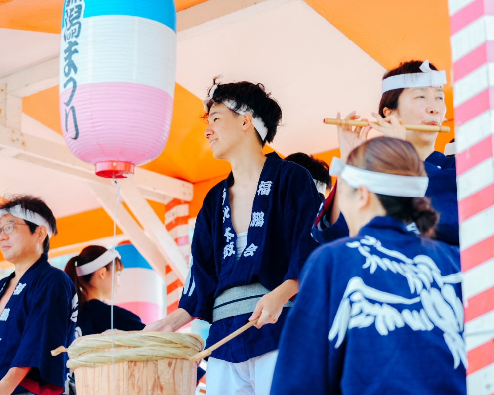 毎年8月初旬に開催される「新潟まつり」。まちなかを練り歩く神輿と共に祭りを盛り上げるのが、万代太鼓のお囃子です。万代太鼓は1968(昭和43)年に、新潟まつりの活性化を願い生まれたもの。軽快な篠笛がメロディーを奏で、大小の和太鼓と樽太鼓がリズムを刻み、金属製の打楽器「あたりがね」が高音のアクセントを加えます。新潟市内に約20の演奏団体があり、1979(昭和54)年創設の「万代太鼓 福鵬会」はフクダグループ社員で構成される、通年で活動している唯一の企業団体です。現在中心となって活動する若手4名と大ベテラン1名が、今年の新潟まつりを振り返ります。
