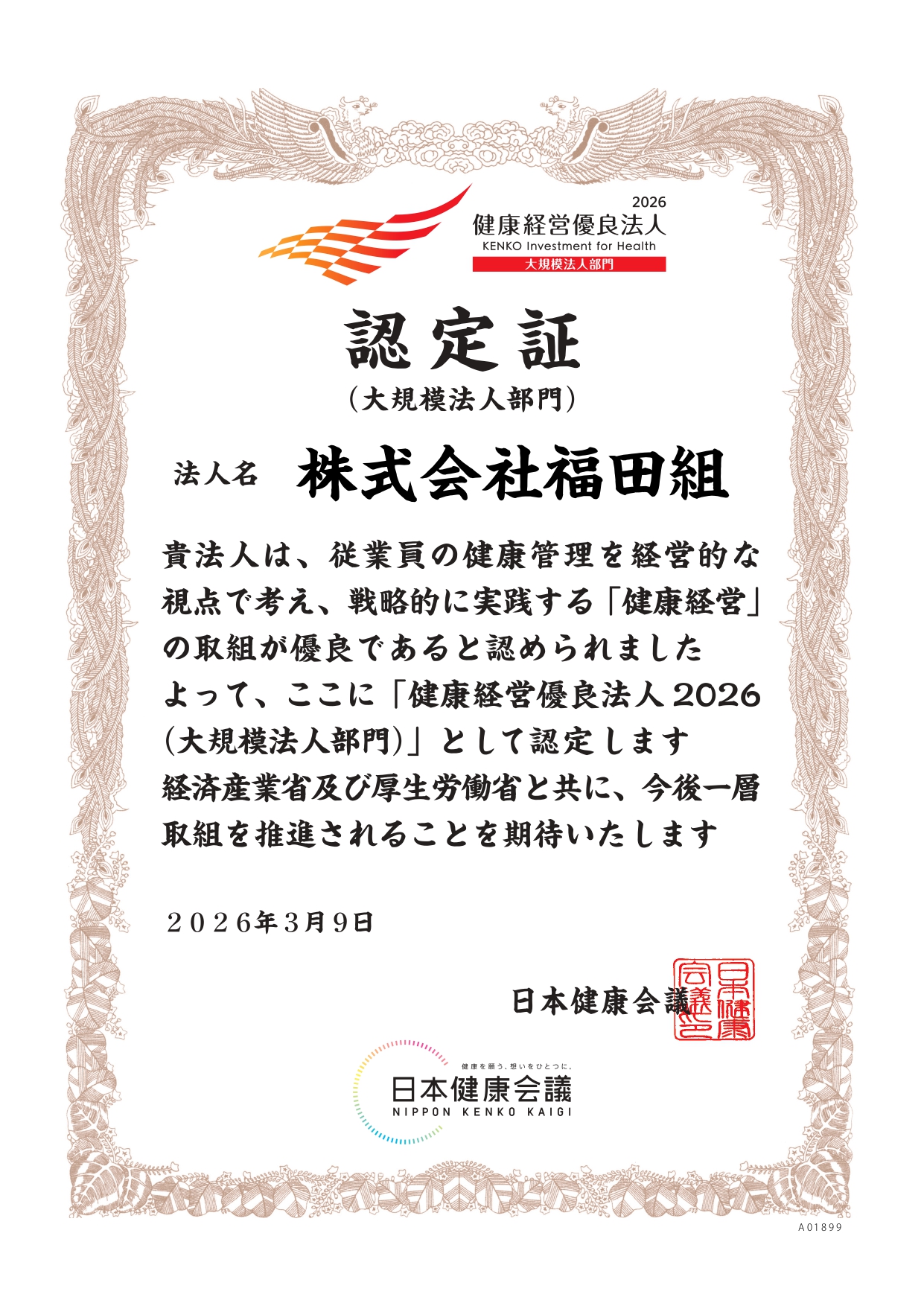 経営理念のひとつである「わが社は挑戦する企業体質のもと人間と環境を大切にし感動的価値の創造」を実践することにより、社員の働きがいと幸せを追求し、心身ともに健康でイキイキと働ける企業を目指して、健康経営に取り組むことを宣言致します。
